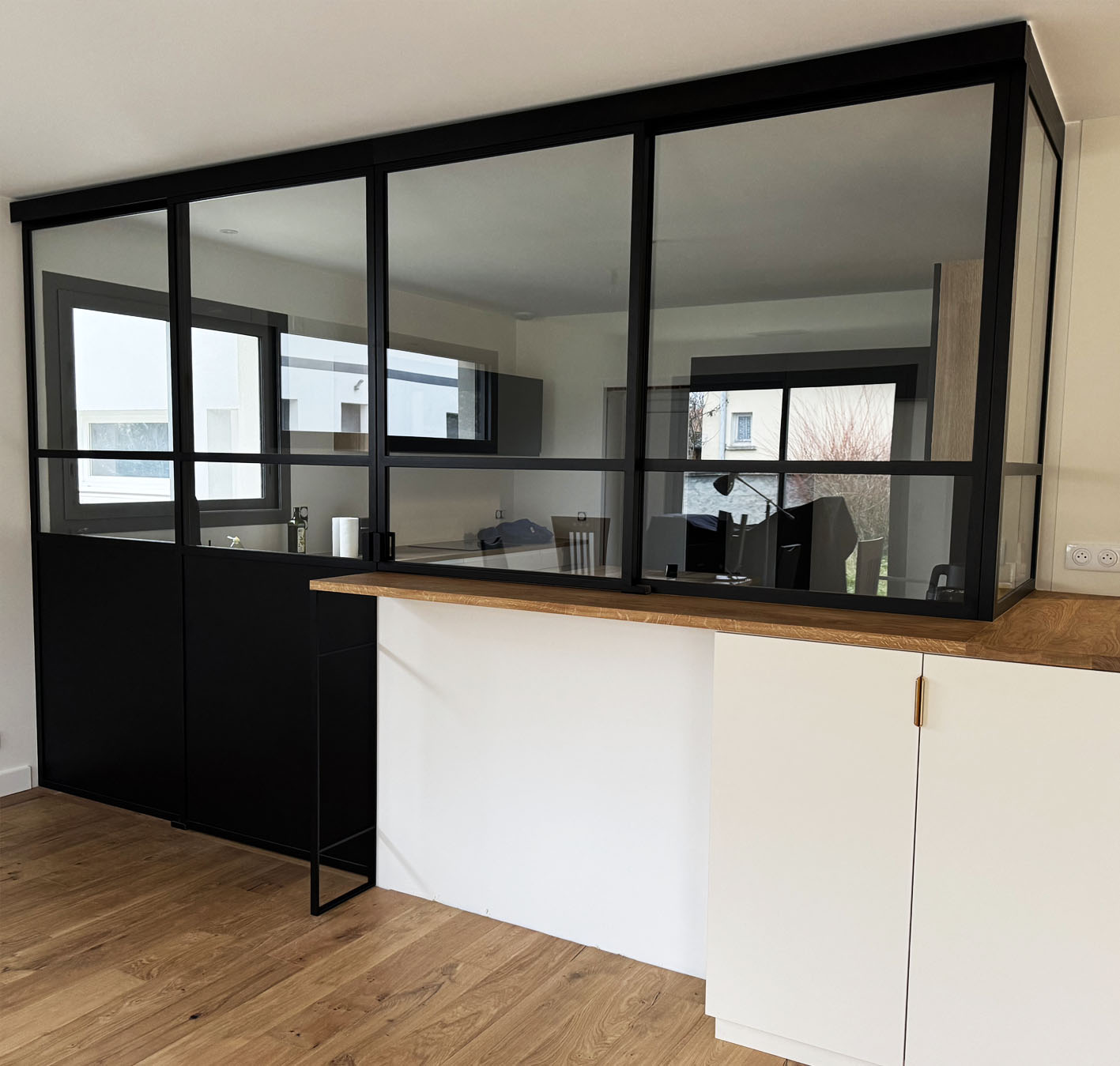 Verrière sur mesure, avec sa porte et sa fenêtre coulissantes, elle apporte une touche élégante et fonctionnelle à cet intérieur en séparant la cuisine sans la cloisonner complètement.